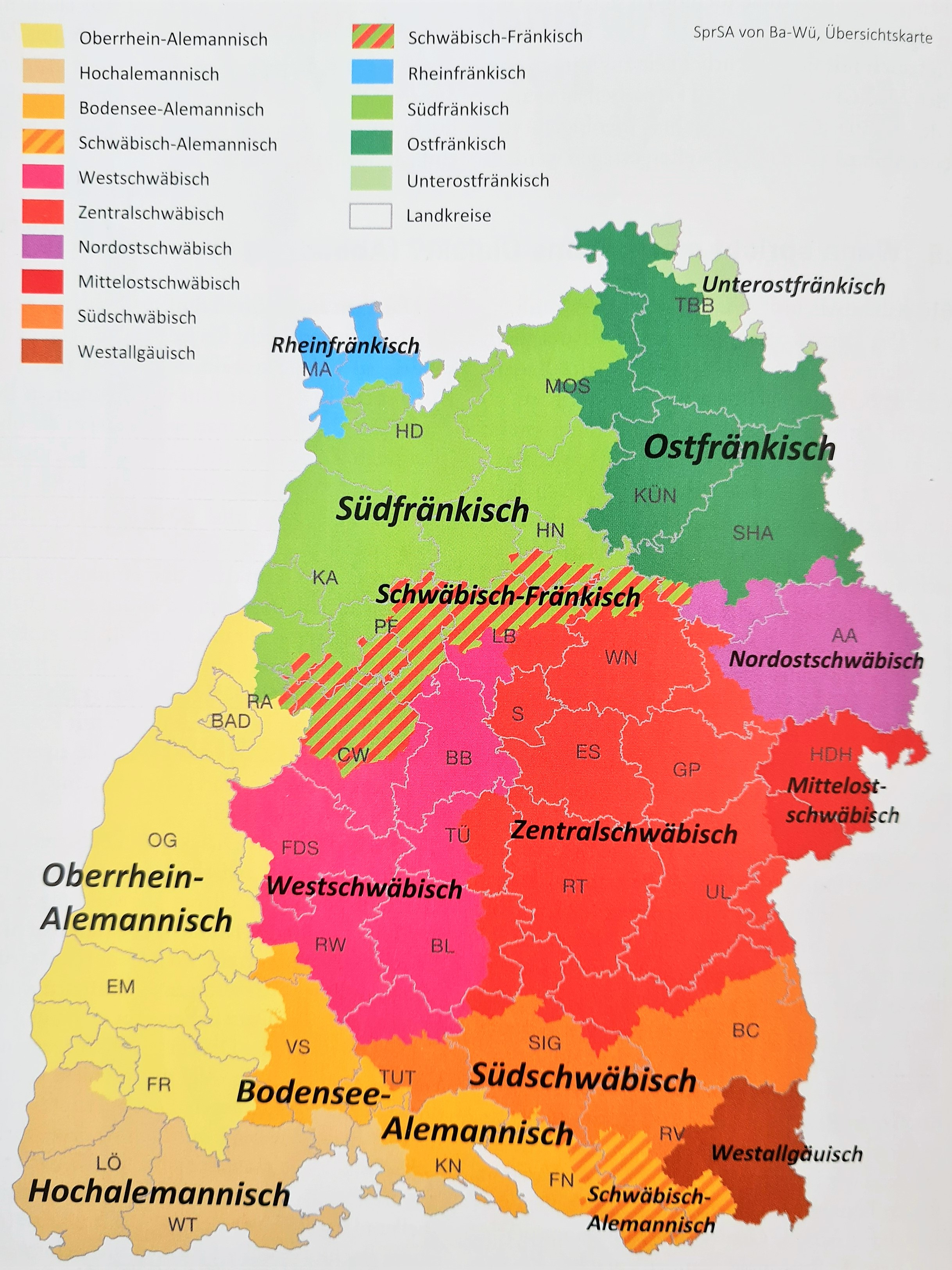 In Baden-Württemberg gibt es im Wesentlichen zwei große Dialektfamilien. Im Süden das Alemannische, wobei das Schwäbische ebenfalls ein alemannischer Dialekt ist und im Norden das Fränkische. Wie angedeutet, hat das Alemannische die zweite Lautverschiebung komplett vollzogen, während das Fränkische als eine Übergangsdialektfamilie angesehen werden muss. Das Rheinfränkische, die Gegend um Mannheim, zählt in der Sprachwissenschaft sogar zu den Mitteldeutschen Dialekten.