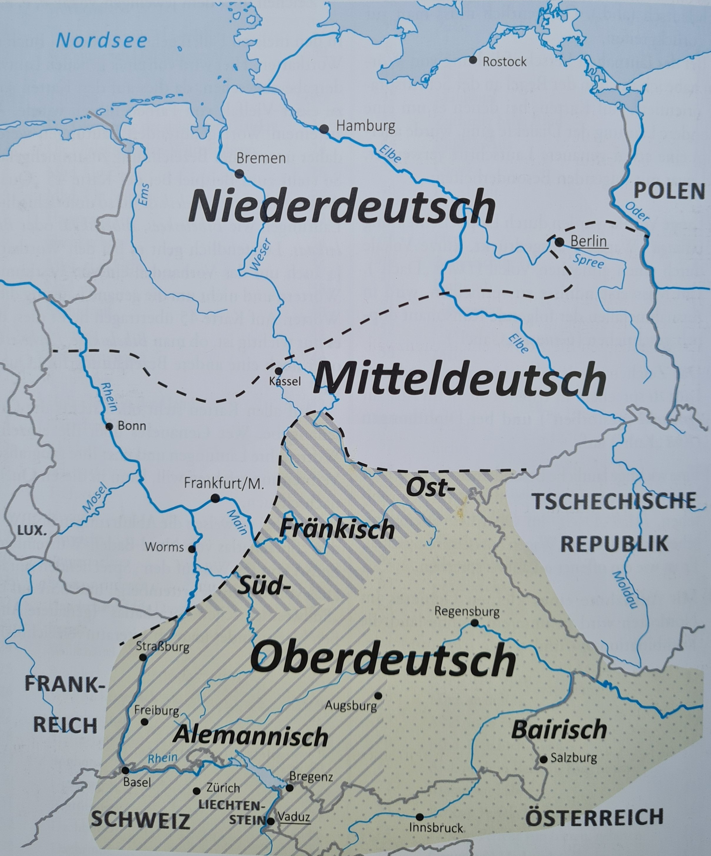 Betrachtet man den Sprachraum des Deutschen, dann kann man im Wesentlichen drei Großgebiete ausmachen, die sich wiederum in mehrere Dialekte unterteilen. Es ist im Norden der Bereich des Niederdeutschen, dann das Mitteldeutsche und im Süden das Oberdeutsche (vgl. Karte 1). Wie man sehen kann fällt das Gebiet um Buchen in den Oberdeutschen Sprachraum.